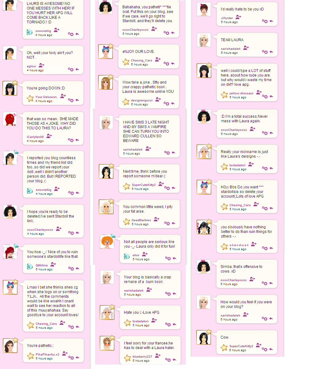 But i also want to say to mickiemousie280, shyflorence, MaryKateperson, j.lee346 & ParrotKite (yes thats right i have named & shamed you! which as all the readers know i would never normally do as i suppose "technically" they havent done anything wrong) That as far as im concerned you are just as bad as she is for harrassing her for NOT giving out her password to HER OWN account!!! How dare you make her feel bad for that!!! Maybe you should try being friends with some of decent people on stardoll instead of making friends with someone like that & ending up on here! You should ashamed of yourselves!